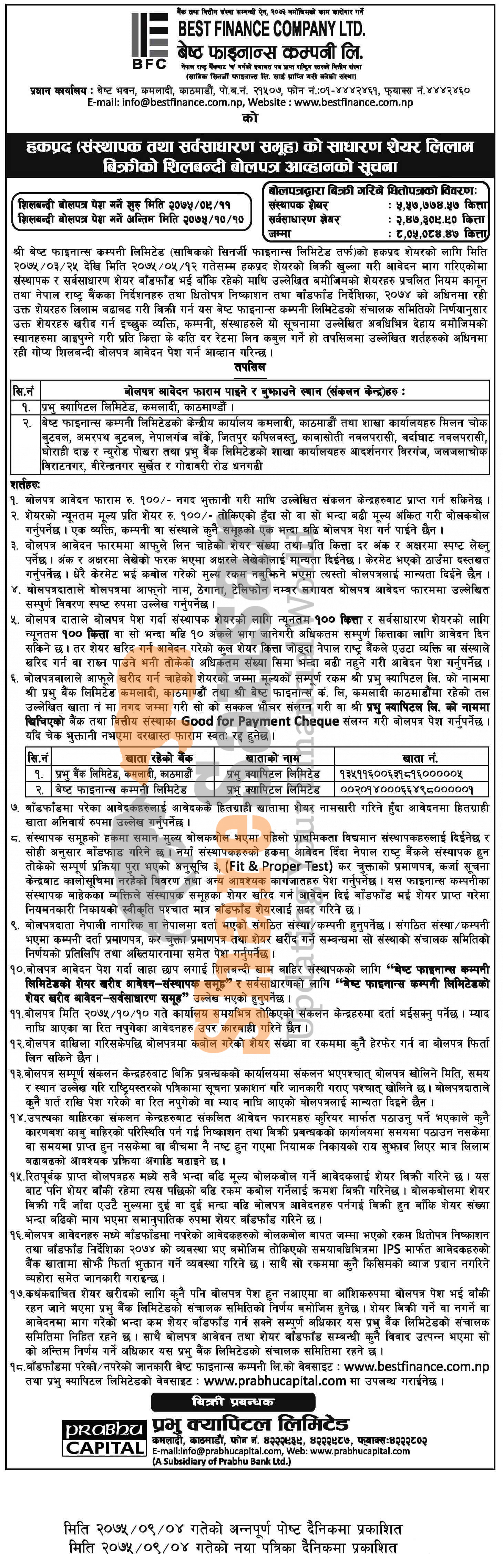 Best Finance Limited is selling its 5,57,774.57 unit promoter shares and 2,47,309.90 Ordinary share in auction to the general public from (11th Poush to 10th Magh, 2075).