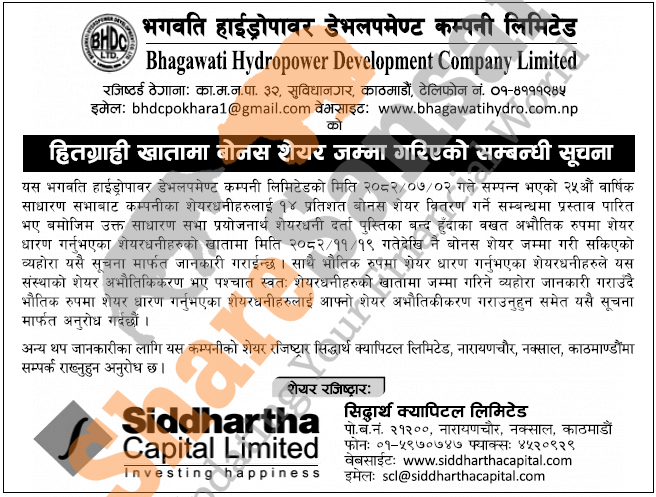 Bhagawati Hydropower Development Company Limited has distributed 14% bonus share directly to DEMAT accounts and urged its shareholders to dematerialize their shares.