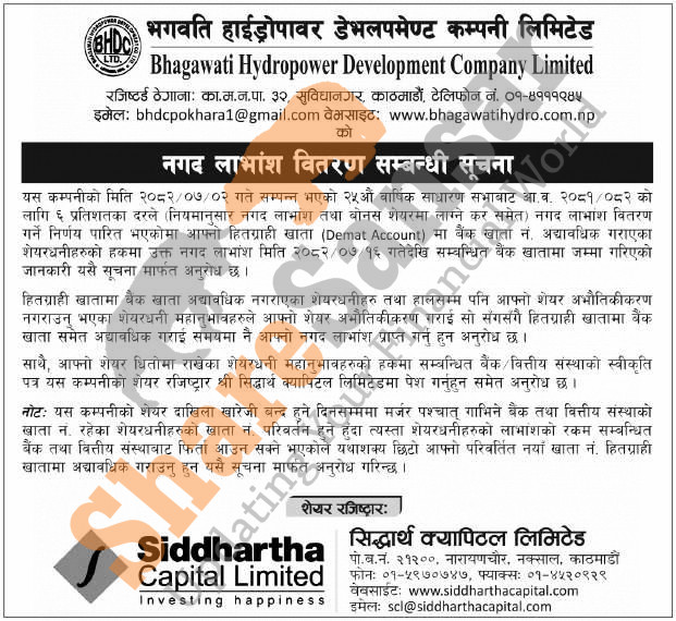 Bhagawati Hydropower Development Company Limited has distributed 6% cash dividend directly to bank accounts of its shareholders and has urged to dematerialize their shares.
