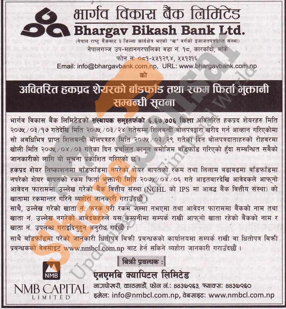 Bhargav Bikas Bank Limited has allotted its 6,67,706 units promoter share in auction to general public on 3rd Shrawan, 2075 and refunding money to non-allottee investors from 6th Shrawan, 2075.