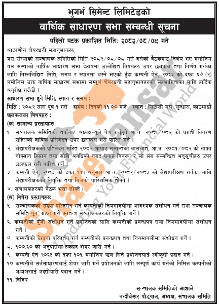 Bhugarbha Cement Limited has announced its AGM going to be held on 1st Poush, 2082.