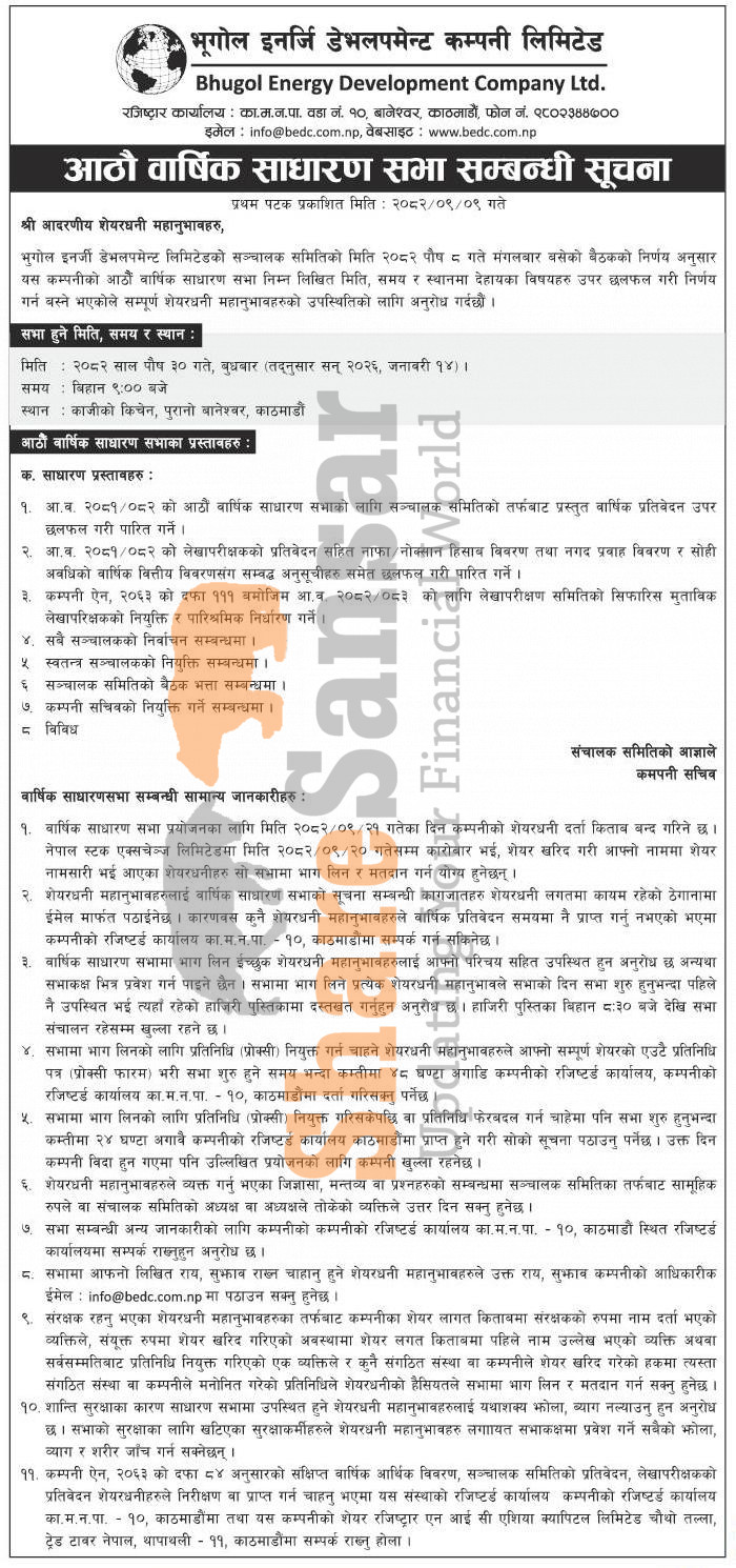 Bhugol Energy Development Company Limited has announced its 8th AGM going to be held on 30th Poush, 2082.