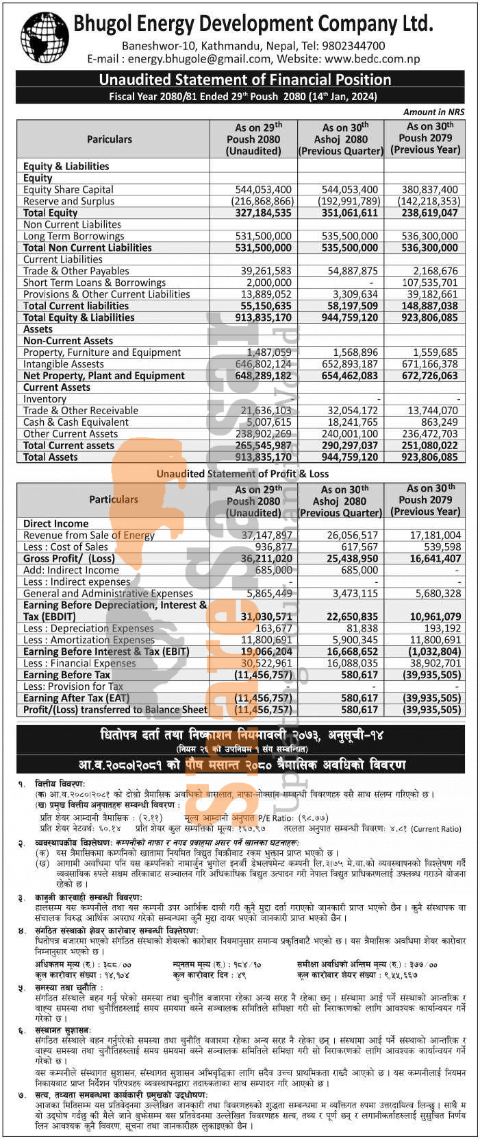 Bhugol Energy Development Company Limited has posted a net loss of Rs 11.45 million and published its 2nd quarter company analysis of the fiscal year 2080/81.