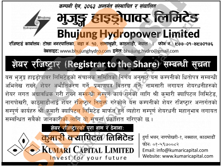 Bhujung Hydropower Limited has appointed Kumari Capital Limited as its share registrar.