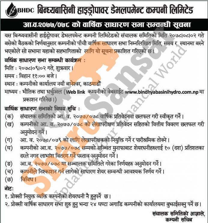 Bindhyabasini Hydropower Development Company Limited has announced its AGM going to be held on 2nd Poush, 2078.