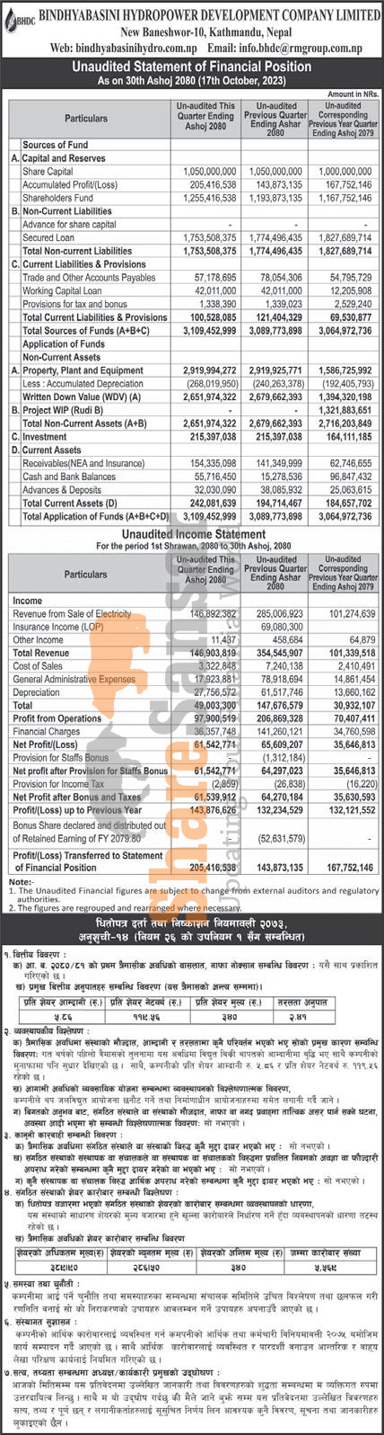 Bindhyabasini Hydropower Development Company Limited has posted a net profit of Rs 61.53 million and published its 1st quarter company analysis of the fiscal year 2080/81.