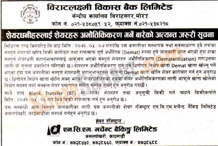 Biratlaxmi Bikas Bank Limited urges its shareholders to dematerialize their securities.