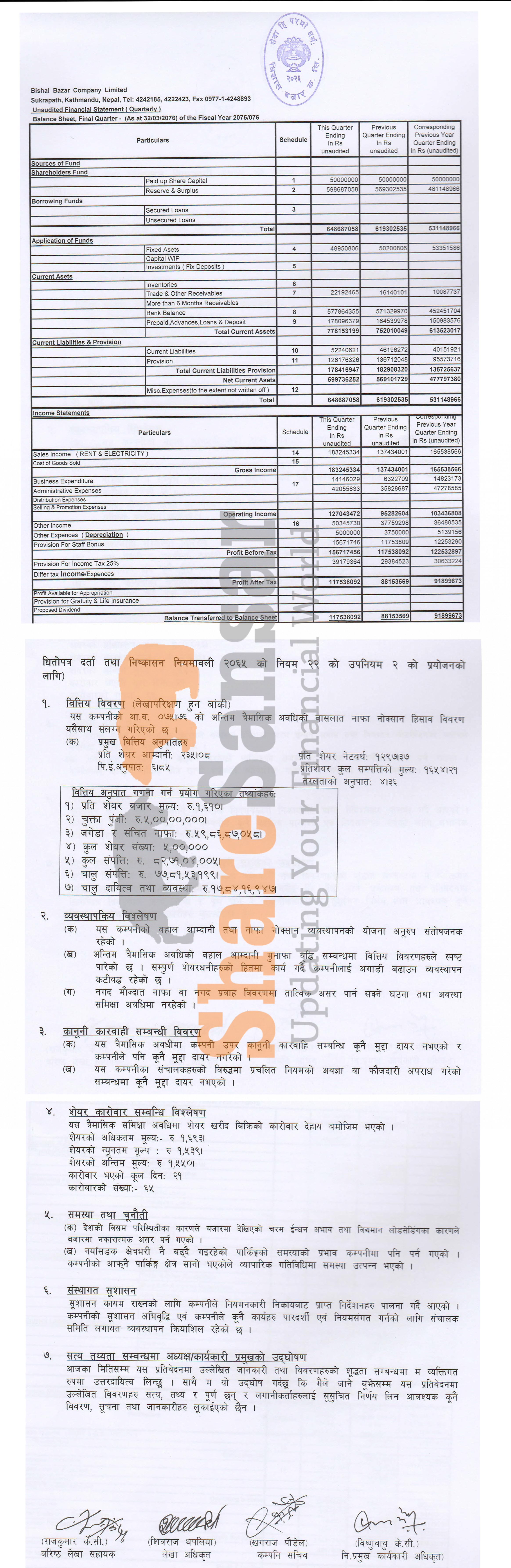 Bishal Bazar Company Limited has posted a net profit of Rs 117.53 million and published its final quarter company analysis of the fiscal year 2075/76.