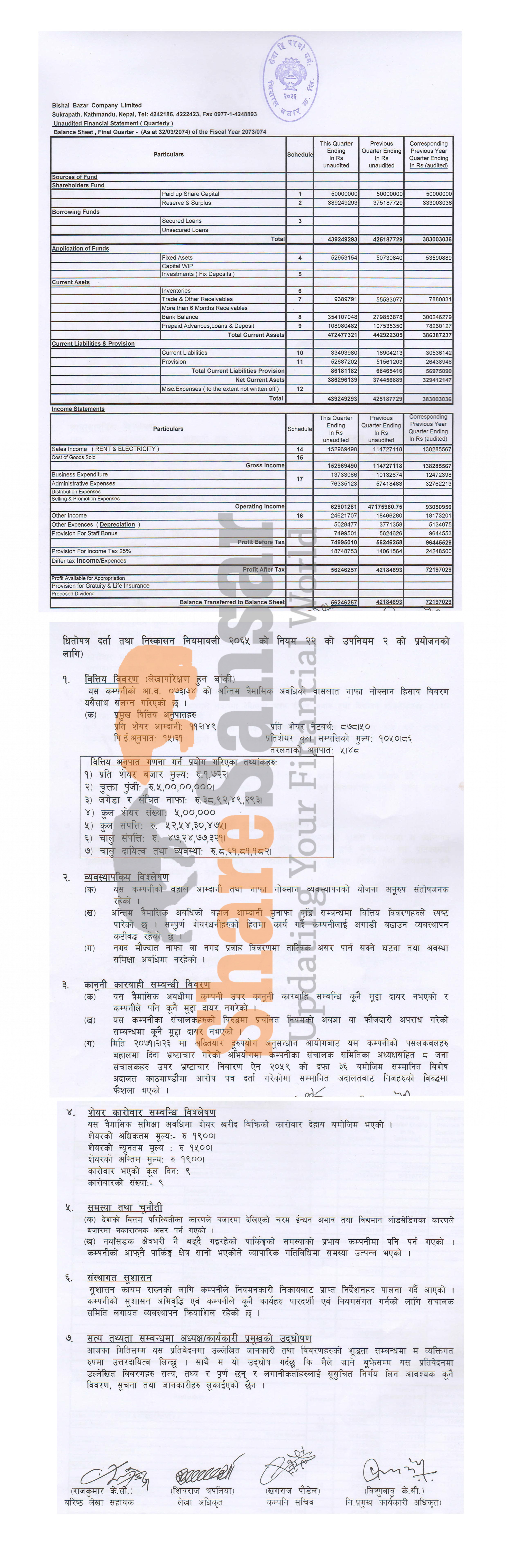 Bishal Bazar Company Limited has posted a net profit of Rs 56.24 million and published its final quarter company analysis of the fiscal year 2073/74.