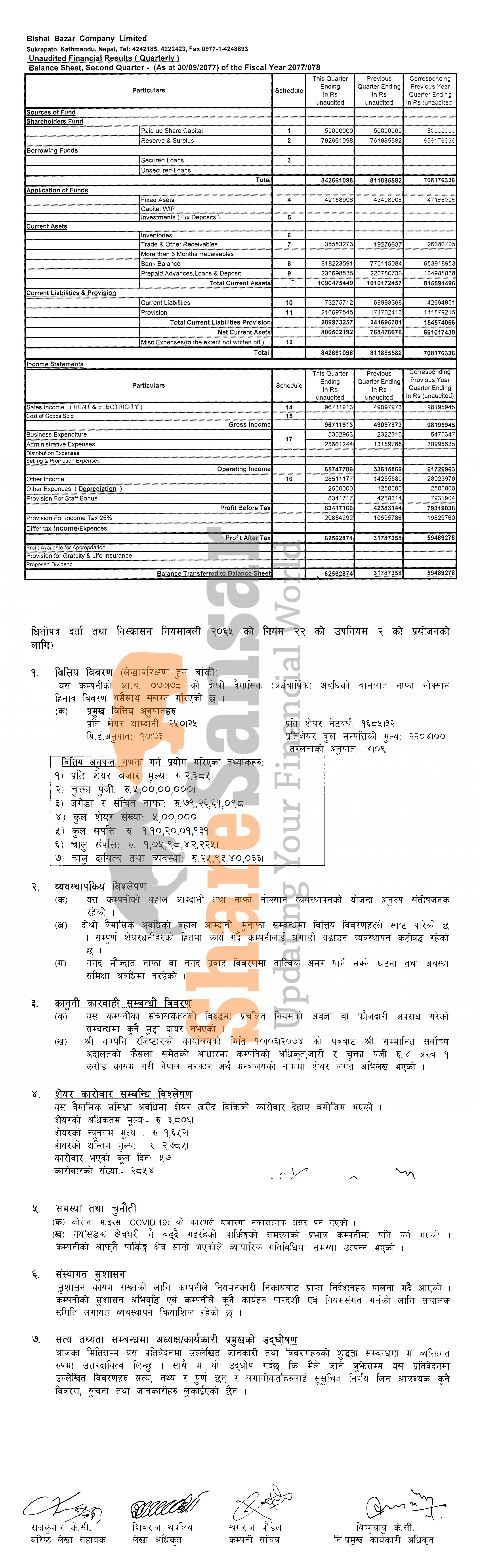 Bishal Bazar Company Limited has posted a net profit of Rs 62.56 million and published its 2nd quarter company analysis of the fiscal year 2077/78.