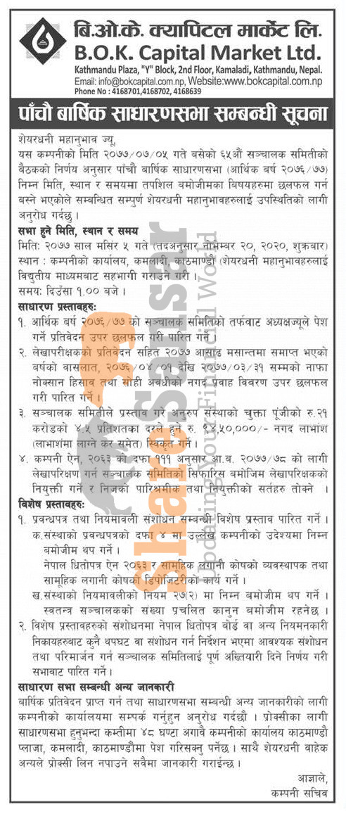 BOK Capital Market Limited has announced its 5th AGM going to be held on 5th Mangsir, 2077.