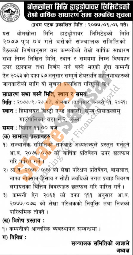 Bomkhola Mini Hydropower Limited has announced its 3rd AGM going to be held on 27th Poush, 2077.
