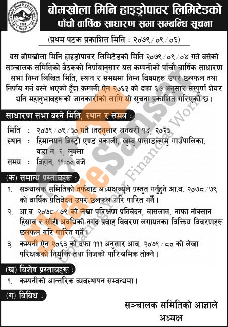 Bomkhola Mini Hydropower Limited has announced its 5th AGM going to be held on 13th Poush, 2079.