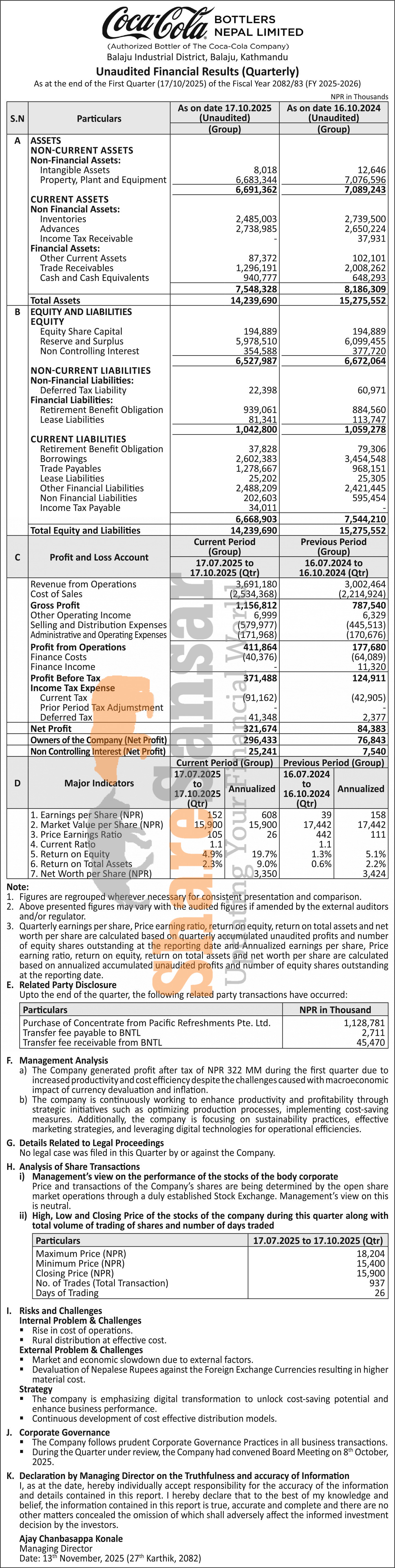 Bottlers Nepal Limited (Balaju) has posted a net profit of Rs 321.67 million and published its 1st quarter company analysis of the fiscal year 2082/83.
