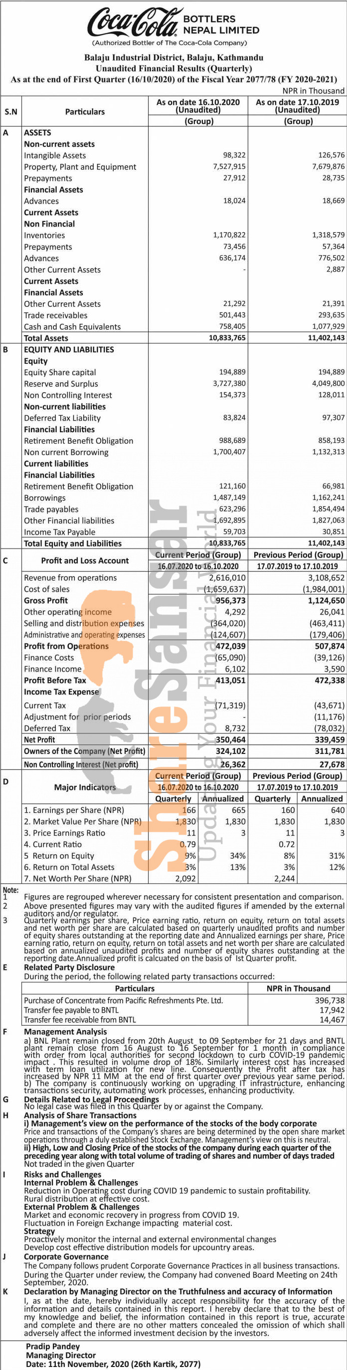 Bottlers Nepal Limited (Balaju) has posted a net profit of Rs 350.46 million and published its 1st quarter company analysis of the fiscal year 2077/78.
