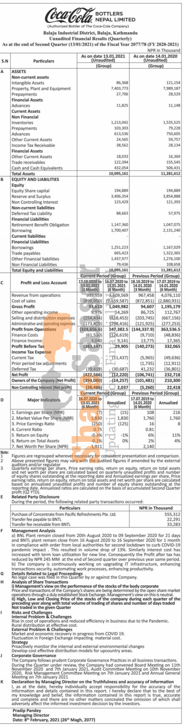 Bottlers Nepal Limited(Balaju) has posted a net loss of Rs 12.22 million and published its 2nd quarter company analysis of the fiscal year 2077/78.