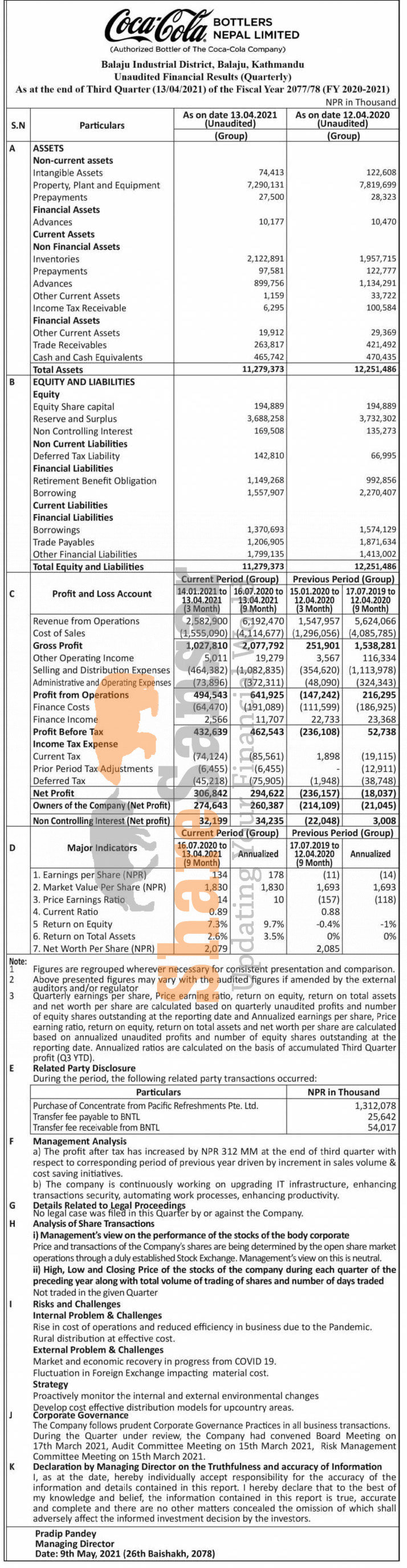Bottlers Nepal Limited(Balaju) has posted a net profit of Rs 294.62 million and published its 3rd quarter company analysis of the fiscal year 2077/78.