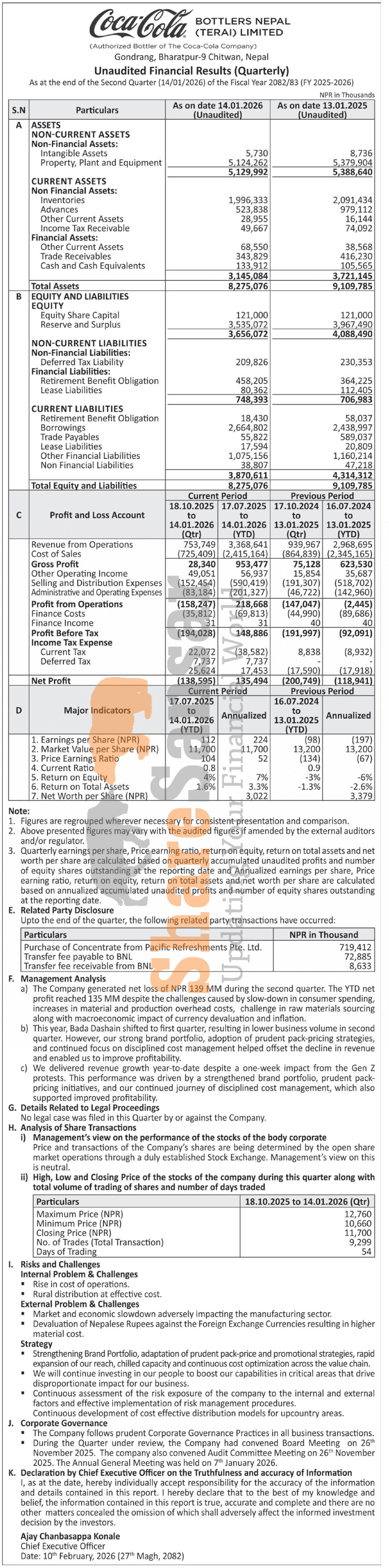 Bottlers Nepal (Terai) Limited has posted a net profit of Rs 135.49 million and published its 2nd quarter company analysis of the fiscal year 2082/83.