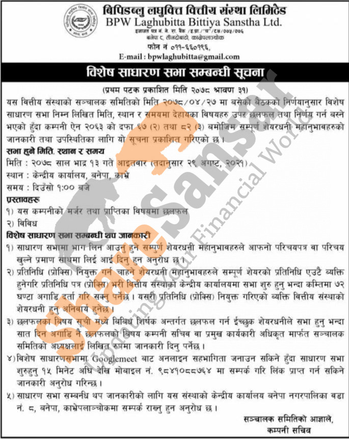 BPW Laghubitta Bittiya Sanstha Limited has announced its SGM going to be held on 13th Bhadra, 2078.