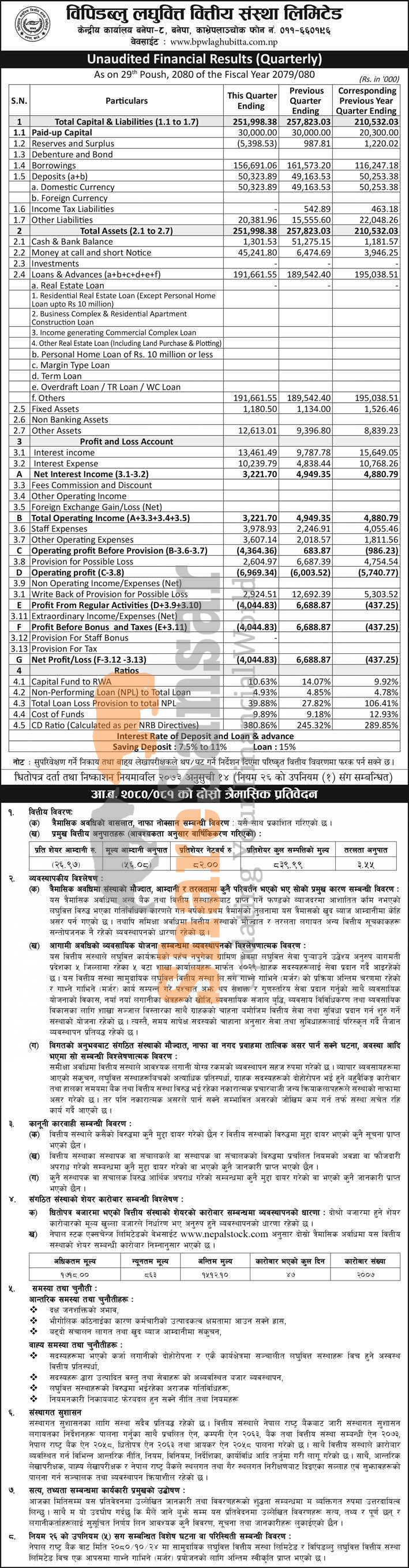 BPW Laghubitta Bittiya Sanstha Limited has posted a net loss of Rs 4.04 million and published its 2nd quarter company analysis of the fiscal year 2080/81.