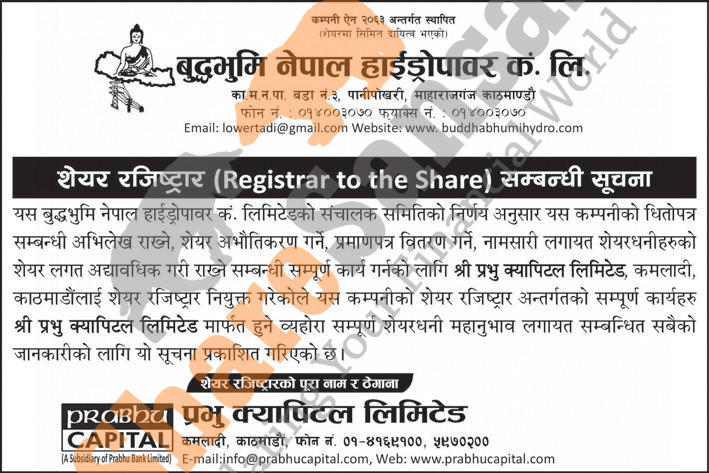 Buddha Bhumi Nepal Hydropower Company Limited has appointed Prabhu Capital Limited as its share registrar.