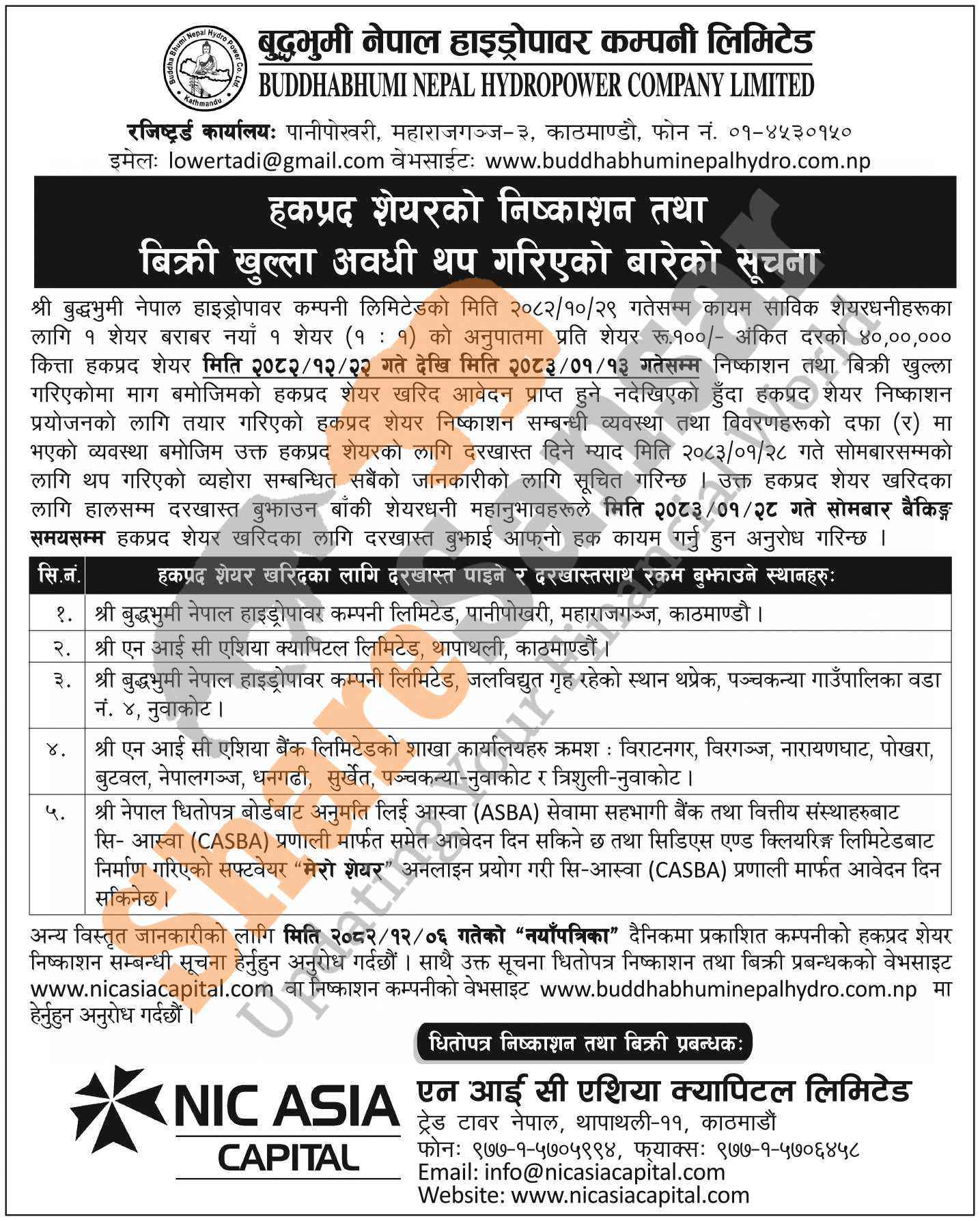 Buddha Bhumi Nepal Hydropower Company Limited has extended its 1:1 ratio 40,00,000 units right share to its shareholders till 28th Baisakh, 2083.
