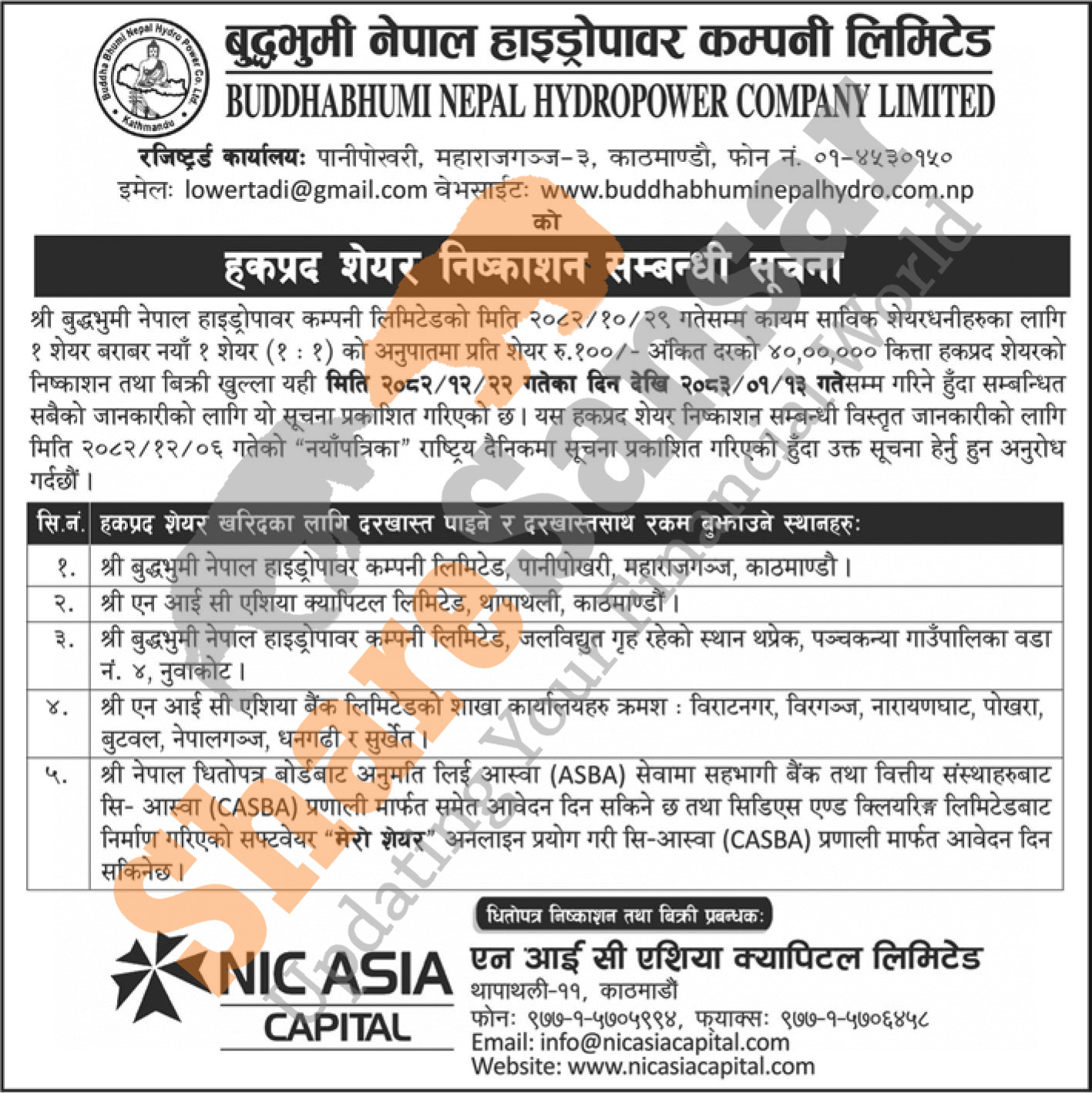 Buddha Bhumi Nepal Hydropower Company Limited has listed a collection center for the upcoming 1:1 ratio 40,00,000 units right share.