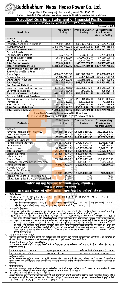 Buddha Bhumi Nepal Hydropower Company Limited has posted a net loss of Rs 4.94 million during the 1st quarter of the fiscal year 2080/81.