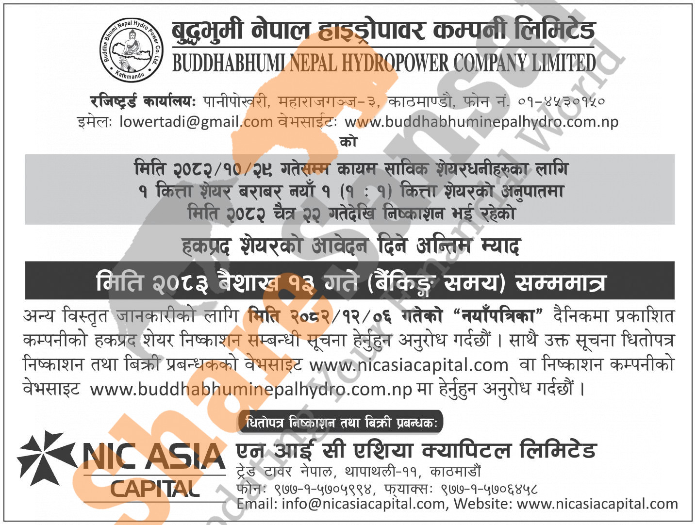 Buddha Bhumi Nepal Hydropower Company Limited has published a deadline for submitting applications for its ongoing 1:1 ratio 40,00,000 units right share on 13th Baisakh, 2083.