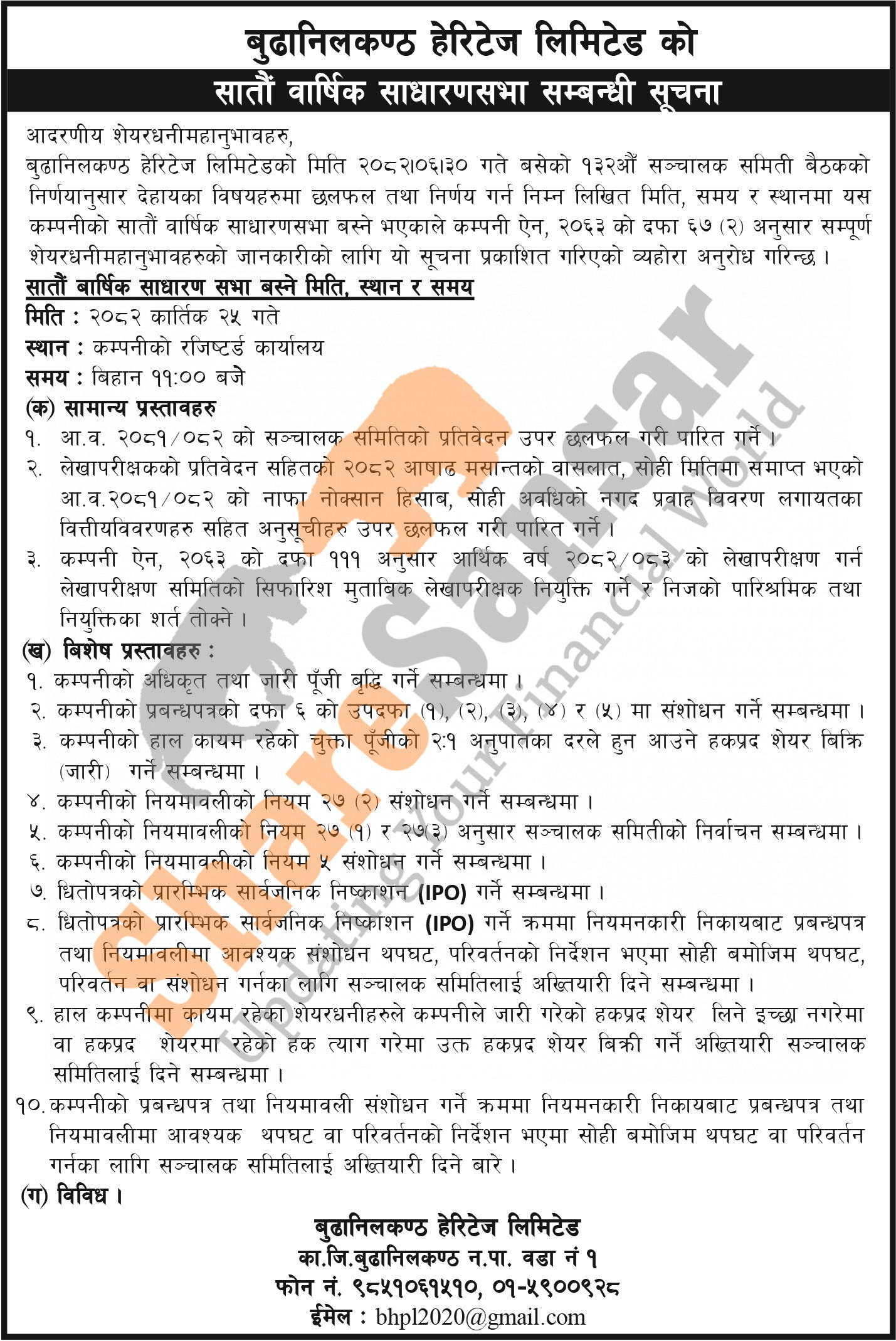 Budhanilkantha Heritage Hotel Limited has announced its 7th AGM going to be held on 25th Kartik, 2082.