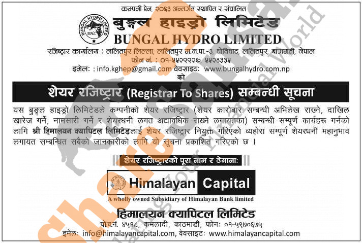 Bungal Hydro Limited has appointed Himalayan Capital Limited as its share registrar.