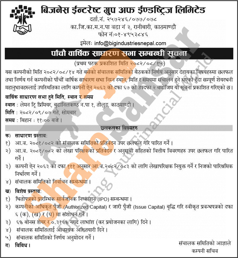 Business Interest Group of Industries Limited has announced its 5th AGM going to be held on 7th Poush, 2082.