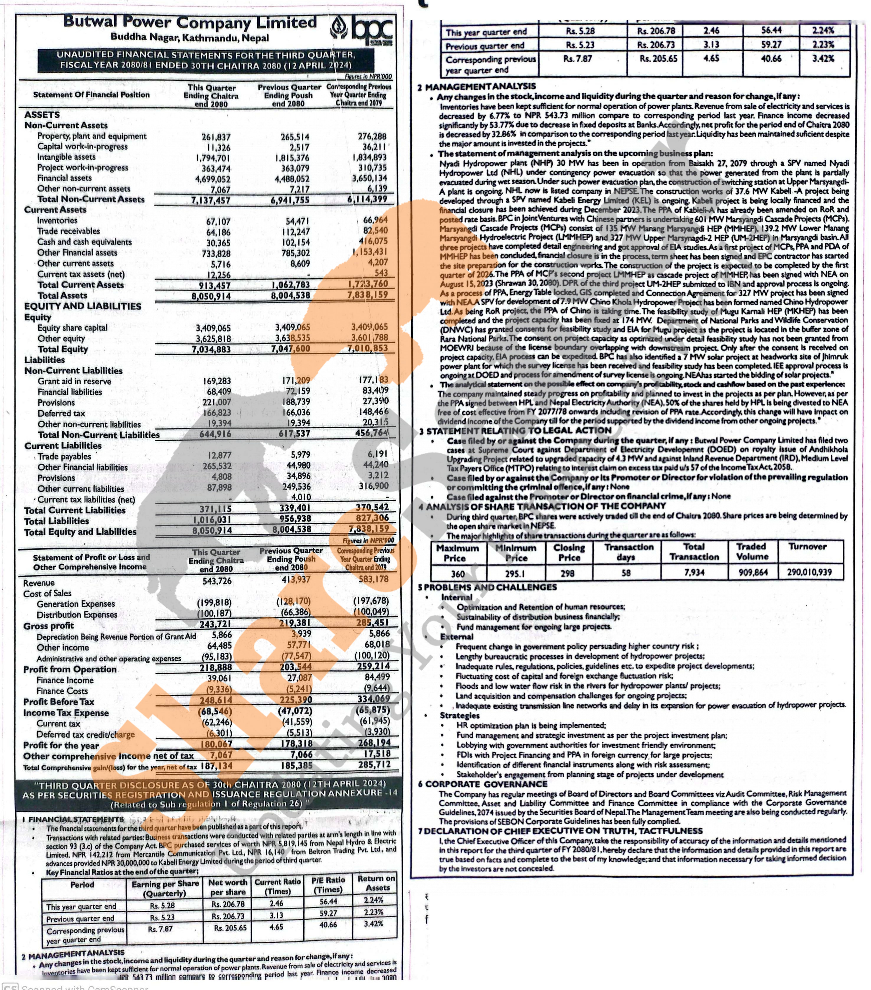 Butwal Power Company Limited has posted a net profit of Rs 180.06 million and published its 3rd quarter company analysis of the fiscal year 2080/81.