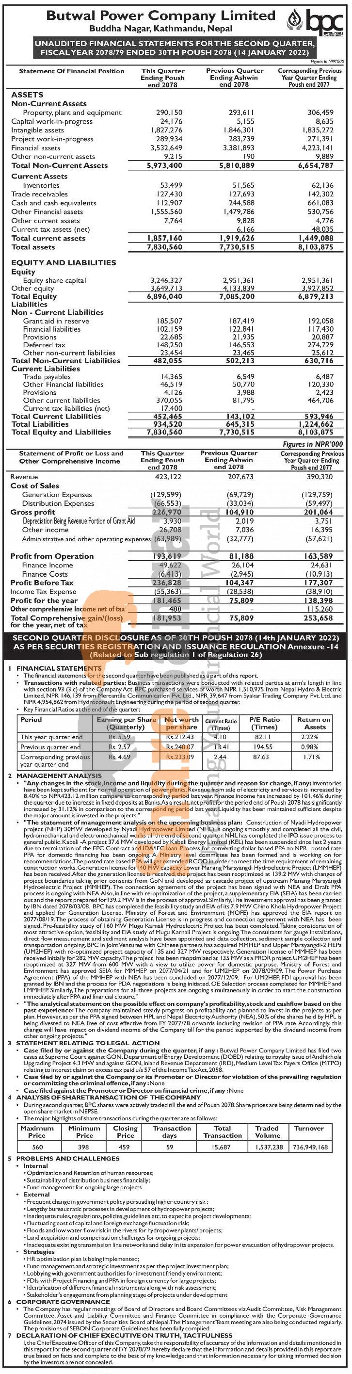 Butwal Power Company Limited has posted a net profit of Rs 181.46 million and published its 2nd quarter company analysis of the fiscal year 2078/79.
