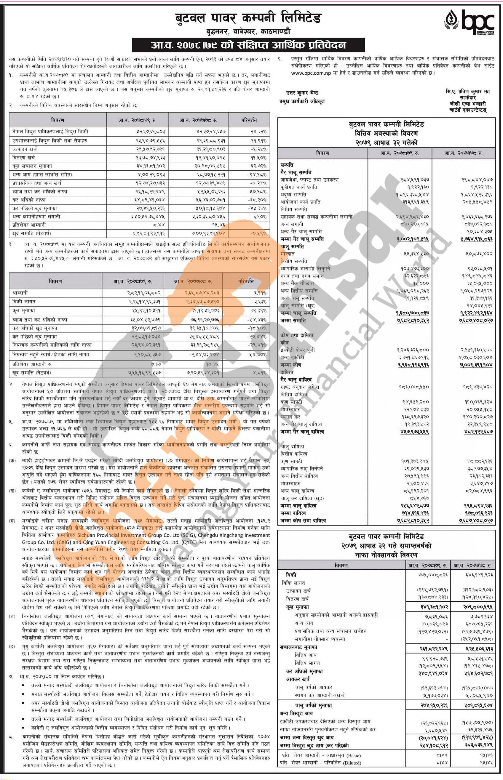 Butwal Power Company Limited has published its annual financial highlights of the fiscal year 2078/79.