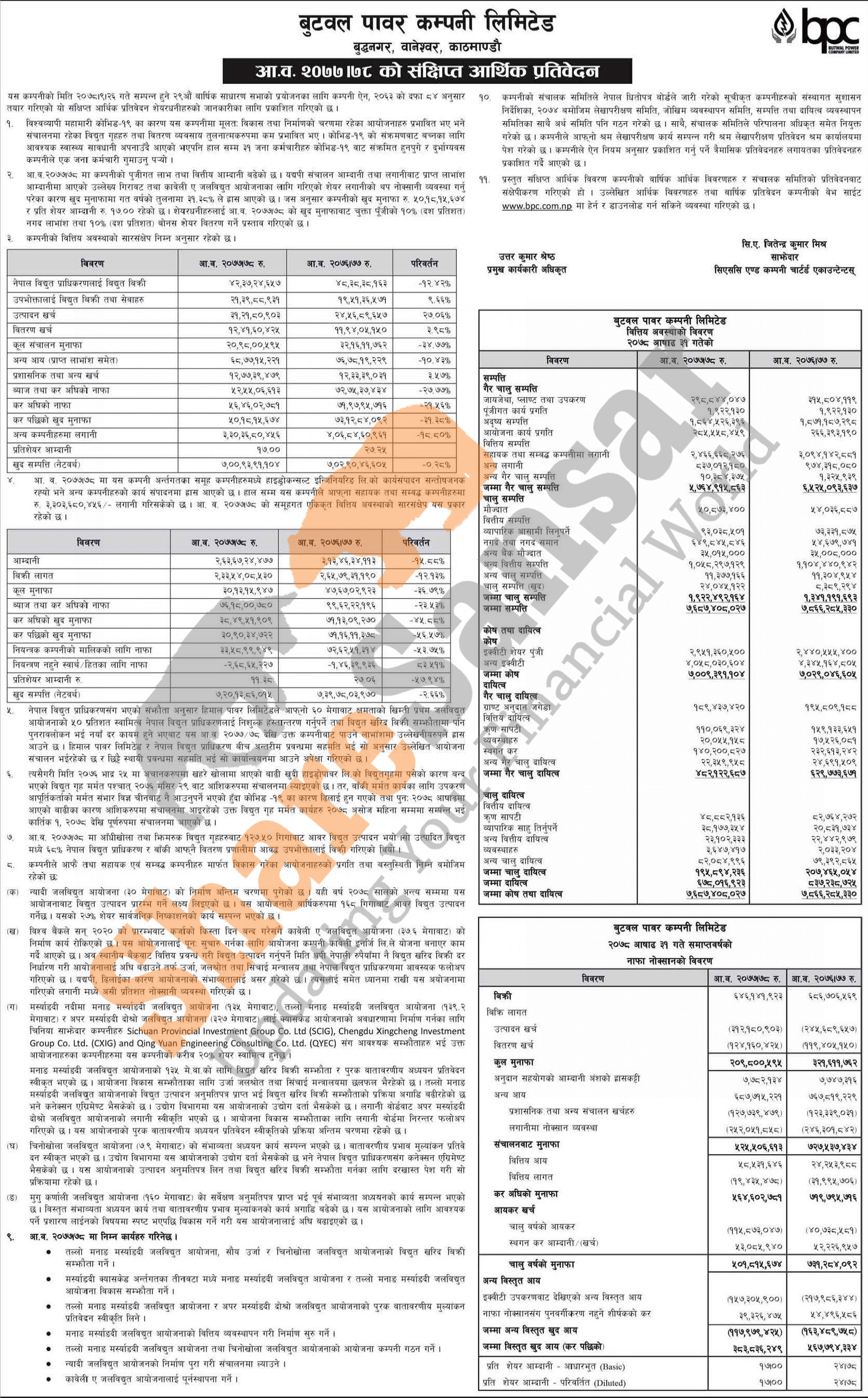Butwal Power Company Limited has published its annual financial statement of the fiscal year 2077/78.