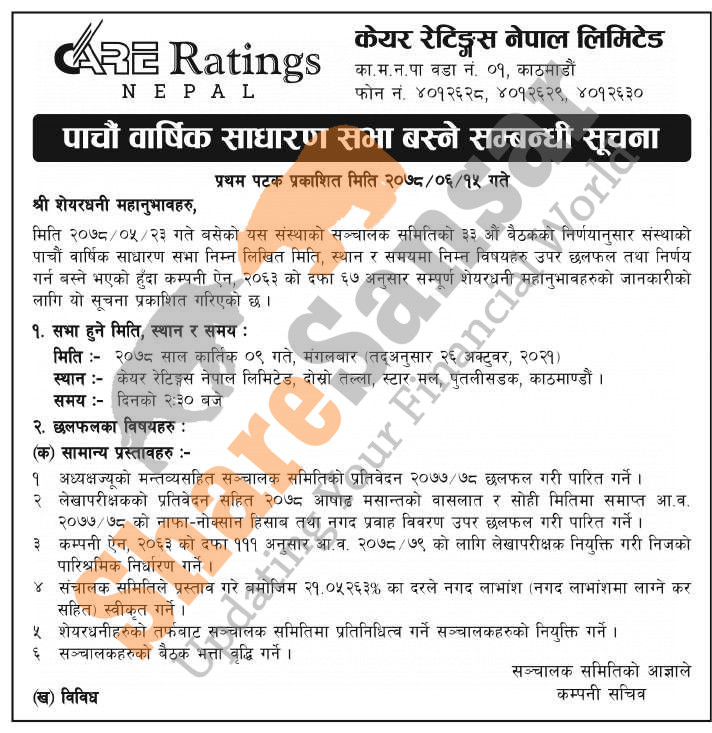 Care Ratings Nepal Limited has announced its 5th AGM going to be held on 9th Kartik, 2078.