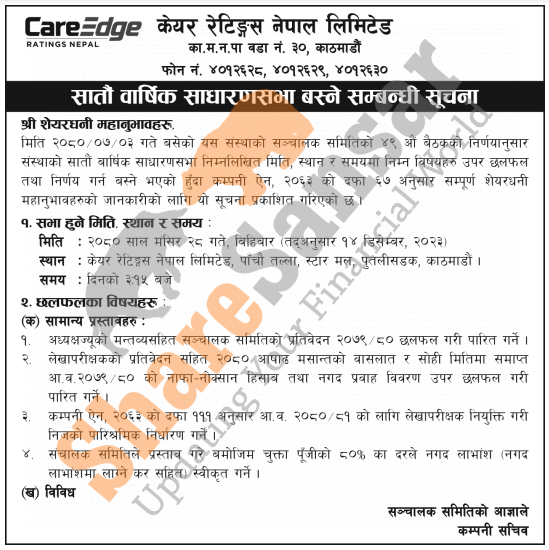 Care Ratings Nepal Limited has announced its 7th AGM going to be held on 28th Mangsir, 2080.