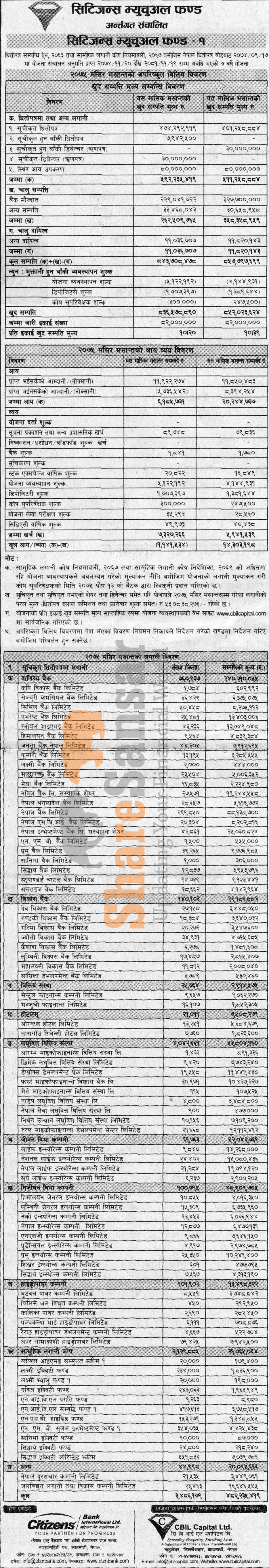 CBIL Capital Limited has published “Citizen Mutual Fund-1” Net Asset Value (NAV) till Mangsir, 2075.