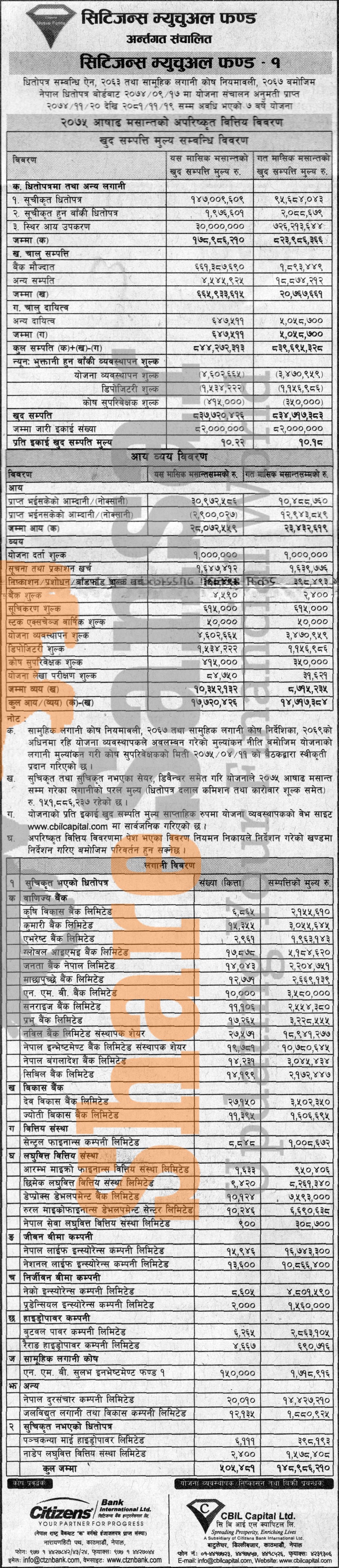 CBIL Capital Limited has published “Citizens Mutual Fund-1” Net Asset Value (NAV) till Ashad, 2075.