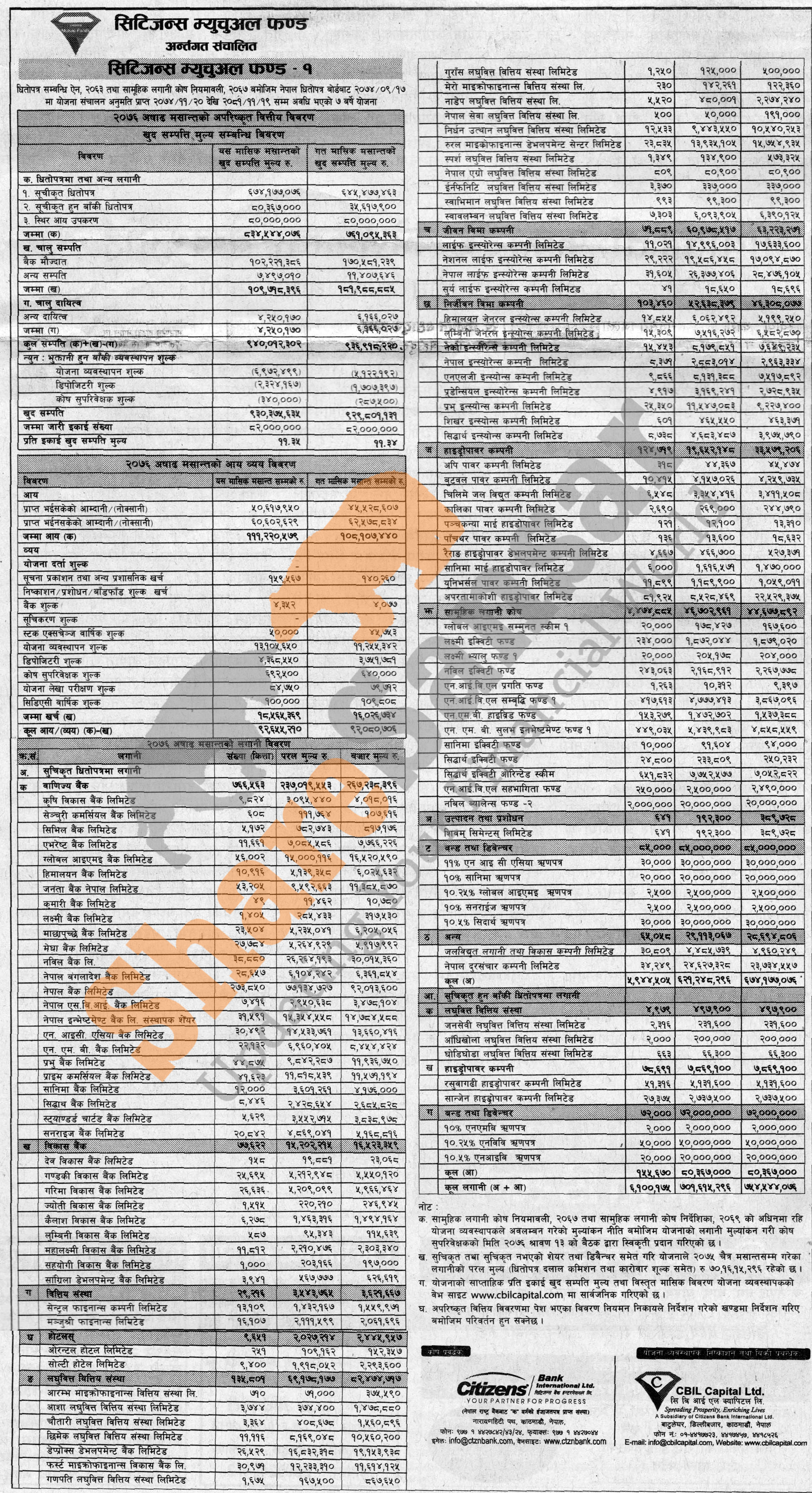 CBIL Capital Limited has published “Citizens Mutual Fund-1” Net Asset Value (NAV) till Ashad, 2076.
