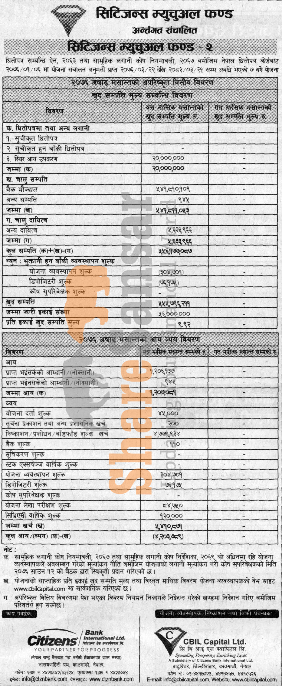 CBIL Capital Limited has published “Citizens Mutual Fund-2” Net Asset Value (NAV) till Ashad, 2076.