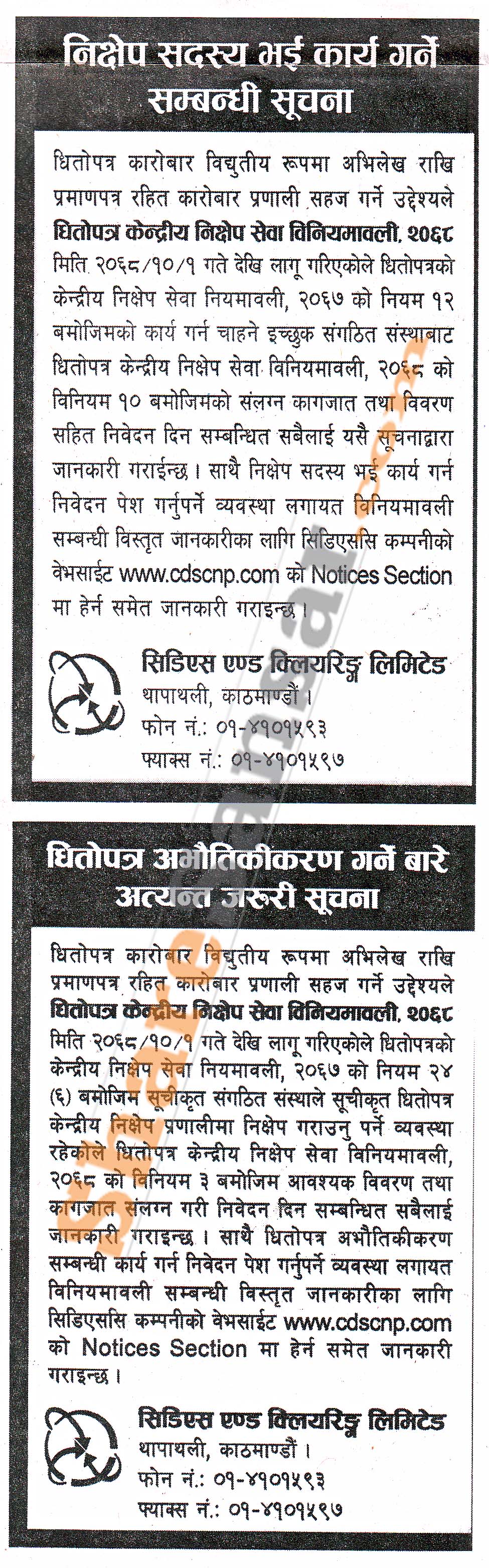 CDS and Clearing Limited is inviting eligible institutions to apply for Depository Participant and to De-materialize their holding securities.