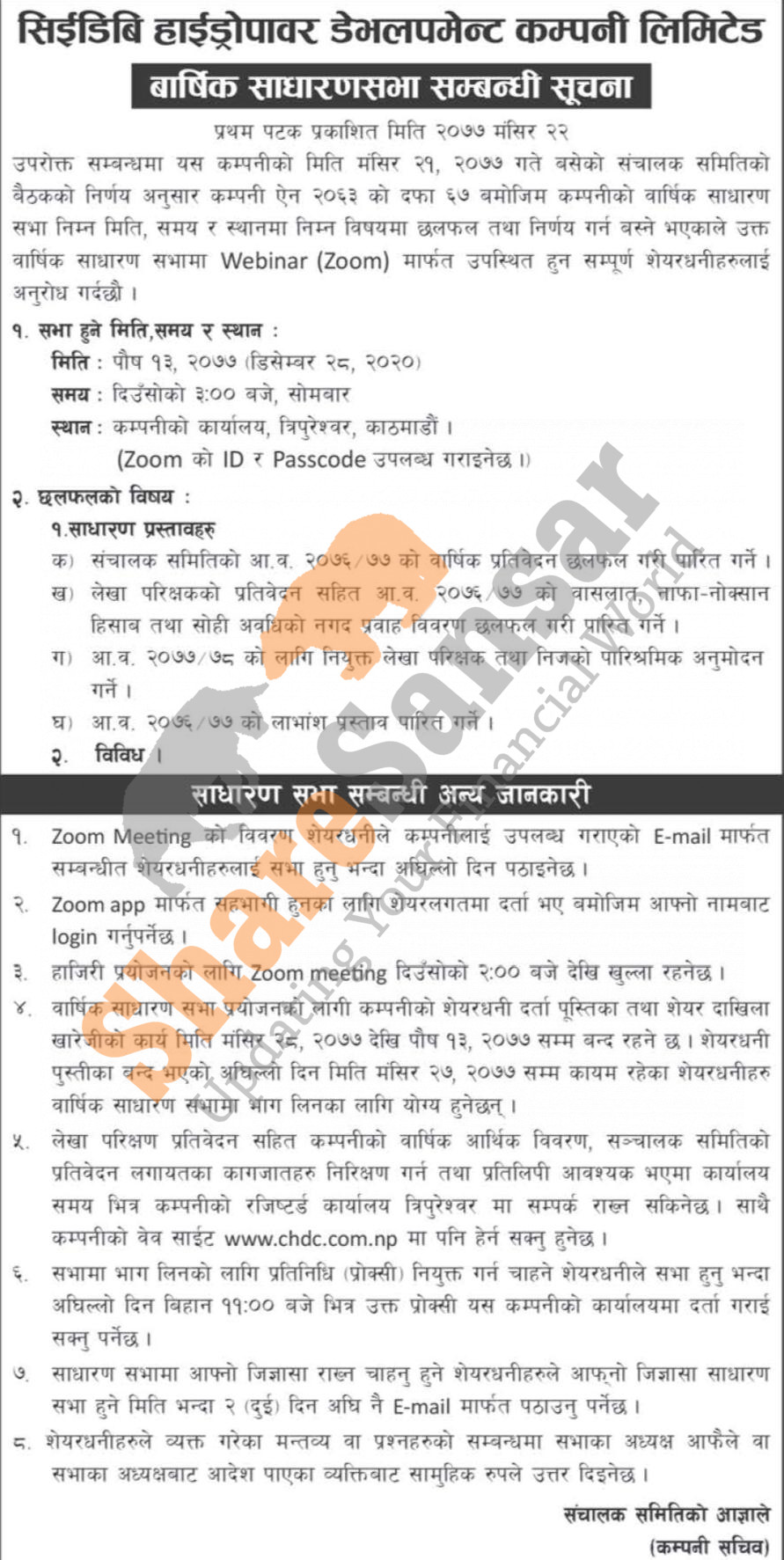 CEDB Hydropower Development Company Limited has announced its AGM going to be held on 13th Poush, 2077.