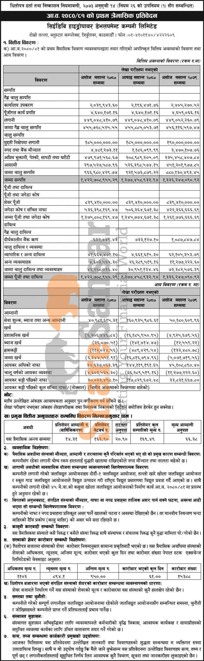 CEDB Hydropower Development Company Limited has posted a net profit of Rs 30.03 million during the 1st quarter of the fiscal year 2080/81.