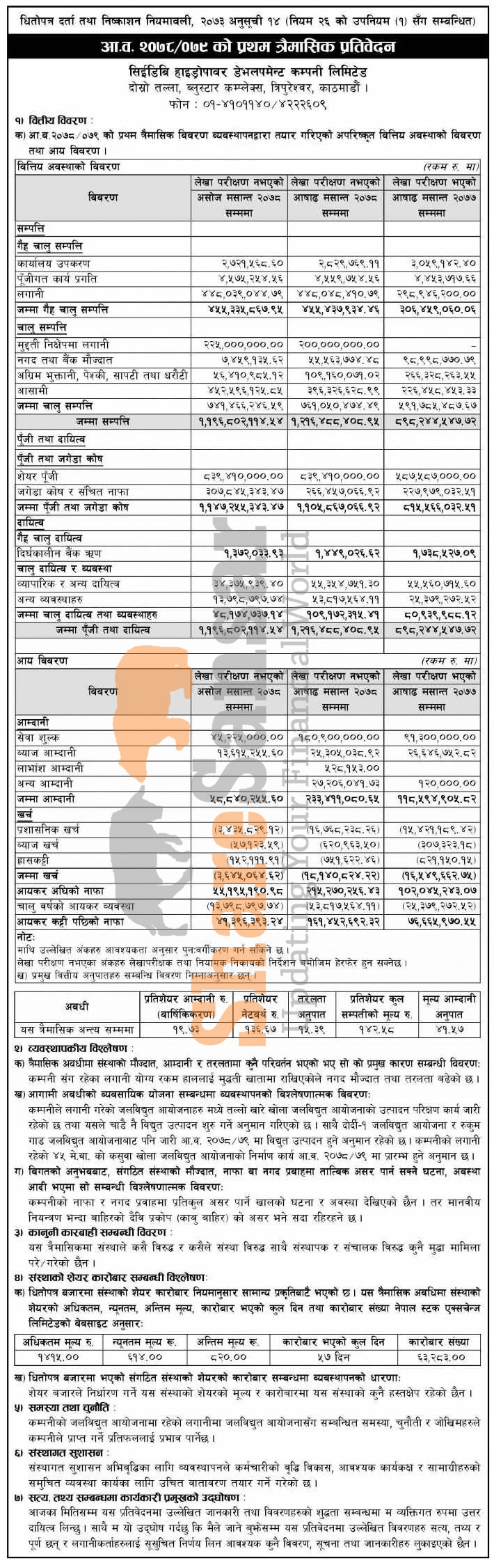 CEDB Hydropower Development Company Limited has posted a net profit of Rs 41.39 million and published its 1st quarter company analysis of the fiscal year 2078/79.
