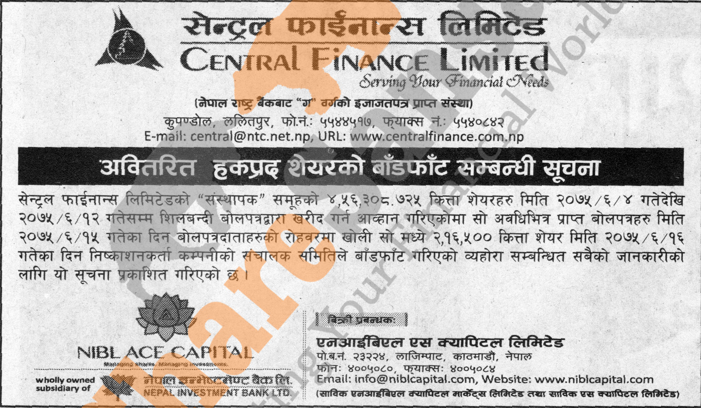 Central Finance Limited has allotted its 4,56,308.725 units promoter shares in auction to general public on 16th Ashwin, 2075.
