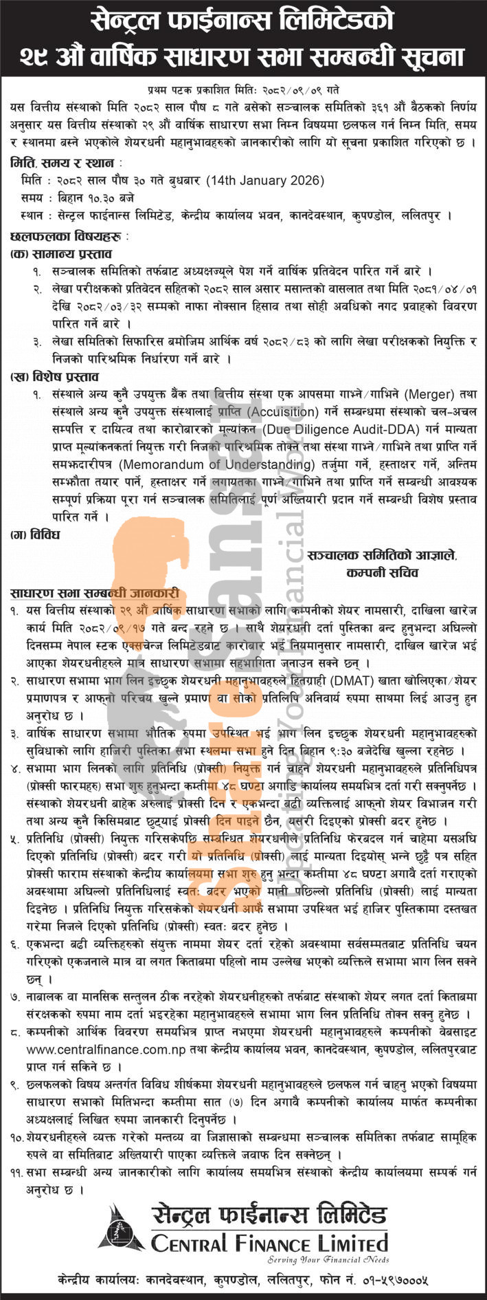 Central Finance Limited has announced its 29th AGM going to be held on 30th Poush, 2082.