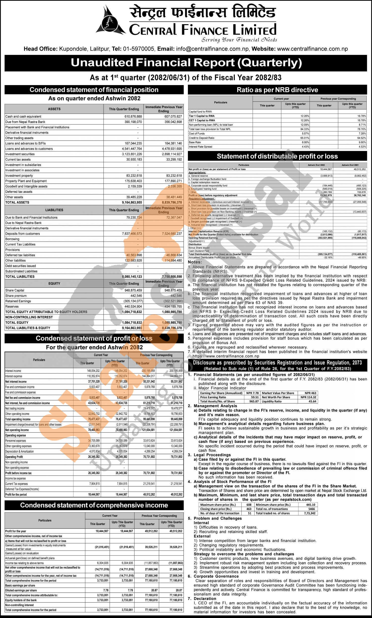 Central Finance Limited has posted a net profit of Rs 18.44 million and published its 1st quarter company analysis of the fiscal year 2082/83.