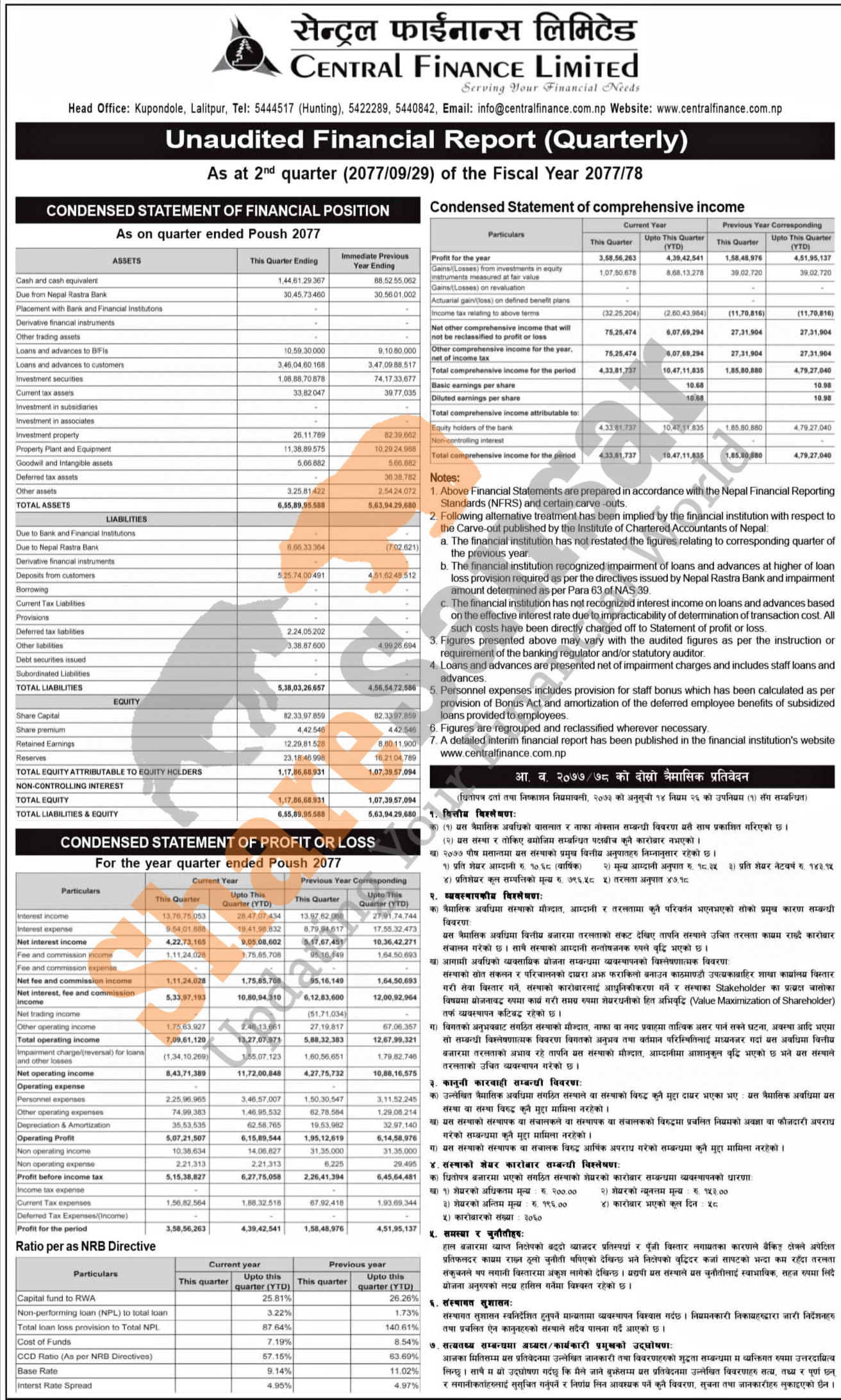 Central Finance Limited has posted a net profit of Rs 43.94 million and published its 2nd quarter company analysis of the fiscal year 2077/78.